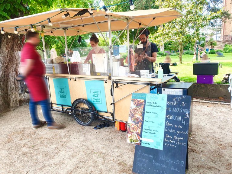 Willkommen an unserem Zayt&Zaatar-Foodbike! Mit unserem Küchenanhänger, können wir eine große Menge an Speisen anbieten. Der Anhänger wir von einem E-Bike gezogen und ist wendig und flexibel an den verschiedensten Orten einsetzbar. Wir sind mit Ofen, Friteuse und Kühlvitrine unterwegs, wodurch wir verschiedene Gerichte wie frische Falafel, Zaatrabrot im Ofen, Tagesgerichte uvm. zubereiten können. Ihr findet uns auf verschiedenen Events: Straßenmärkte, Festivals, Geburtstags-, Firmen- oder Hochzeitsfeiern, für die wir auch gerne neue Kreationen schaffen. Schaute in unsere Galerie und Eventübersicht und schreibt uns oder kommt vorbei! Wir freuen uns auf Euch !